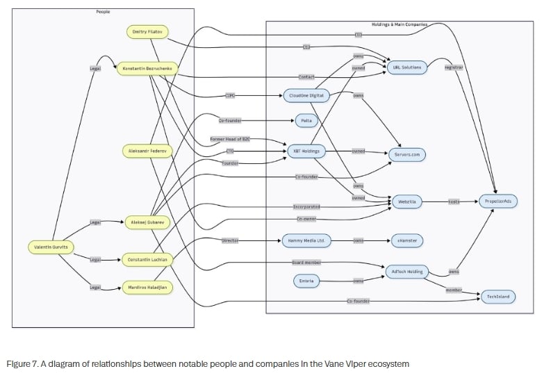 Vane Viper ähnelt VexTrio Viper, allgemein bekannt als VexTrio, über das Infoblox im August 2025 im Rahmen von BlackHat USA ausführlich berichtete. Wie VexTrio besteht auch Vane Viper aus mehreren Unternehmen der Werbebranche, die überwiegend von russischsprachigen Personen geführt werden. Diese Unternehmen präsentieren sich zwar als separate Organisationen, gehören jedoch alle zu einer gemeinsamen Gruppe. Vane Viper und VexTrio sind Teil einer Kohorte, die 2015 fast zeitgleich in Osteuropa und russischen Diaspora-Zentren wie Zypern entstanden ist. VexTrio und Vane Viper werben mit ihrer Partnerschaft, scheinen jedoch unabhängige Gruppen zu sein.