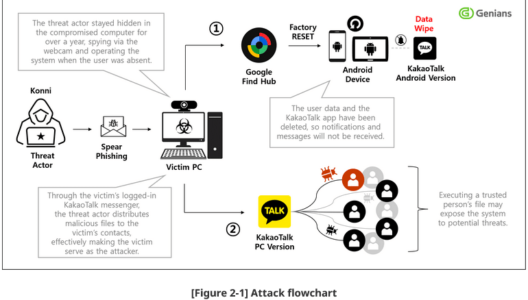 Das Genians Security Center (GSC) ordnet die Kampagne der nordkoreanischen KONNI-APT-Gruppe zu, die mit Kimsuky und APT37 in Verbindung steht. Die Angreifer verteilten Schadsoftware über den südkoreanischen Messenger KakaoTalk, getarnt als psychologische Beratungs- oder Stressbewältigungsprogramme. Mithilfe gefälschter Identitäten nutzten sie das Vertrauen ihrer Opfer aus, um infizierte Dateien zu verbreiten.