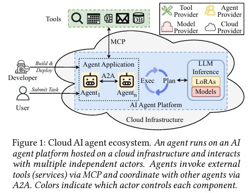 Abbildung 1: Cloud AI agentecosystem. Ein Agent läuft auf einer KI-Agentenplattform, die auf einer Cloud-Infrastruktur gehostet wird, und interagiert mit mehreren unabhängigen Akteuren. Agenten rufen externe Tools (Dienste) über MCP auf und koordinieren sich mit anderen Agenten über A2A. Die Farben zeigen an, welcher Akteur die einzelnen Komponenten steuert.