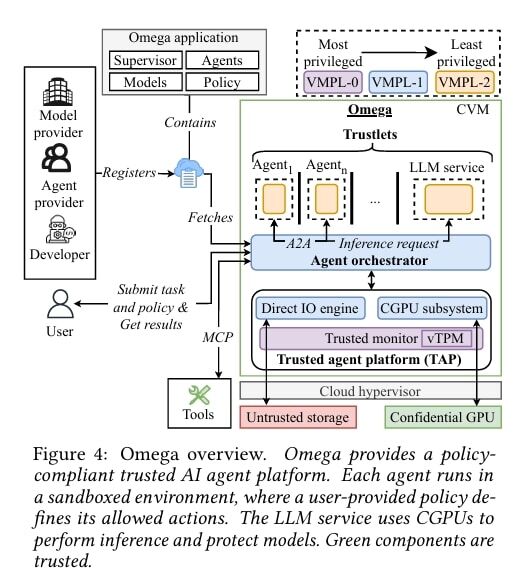 Forscher haben mit Omega ein System entwickelt, das vertrauenswürdige KI-Agenten durch End-to-End-Isolierung ermöglicht. Die Plattform etabliert überprüfbares Vertrauen zwischen allen beteiligten Akteuren und protokolliert jede externe Interaktion mit nachvollziehbarer Herkunft. Omega nutzt CVMs und Confidential GPUs als Basis für eine vertrauenswürdige Agenten-Infrastruktur, die mehrere Agenten innerhalb einer einzelnen CVM durch verschachtelte Isolierungsmechanismen ausführt.