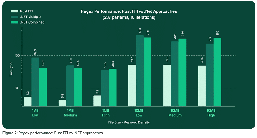 An diesem Punkt weitete das Team seine Suche auf andere Programmiersprachen aus. Rust stand bereits für andere Komponenten im Einsatz und verfügt über eine besonders leistungsfähige Regex-Engine. Um diese zu nutzen, war eine Brücke zwischen den Laufzeitumgebungen erforderlich: Foreign Function Interface.