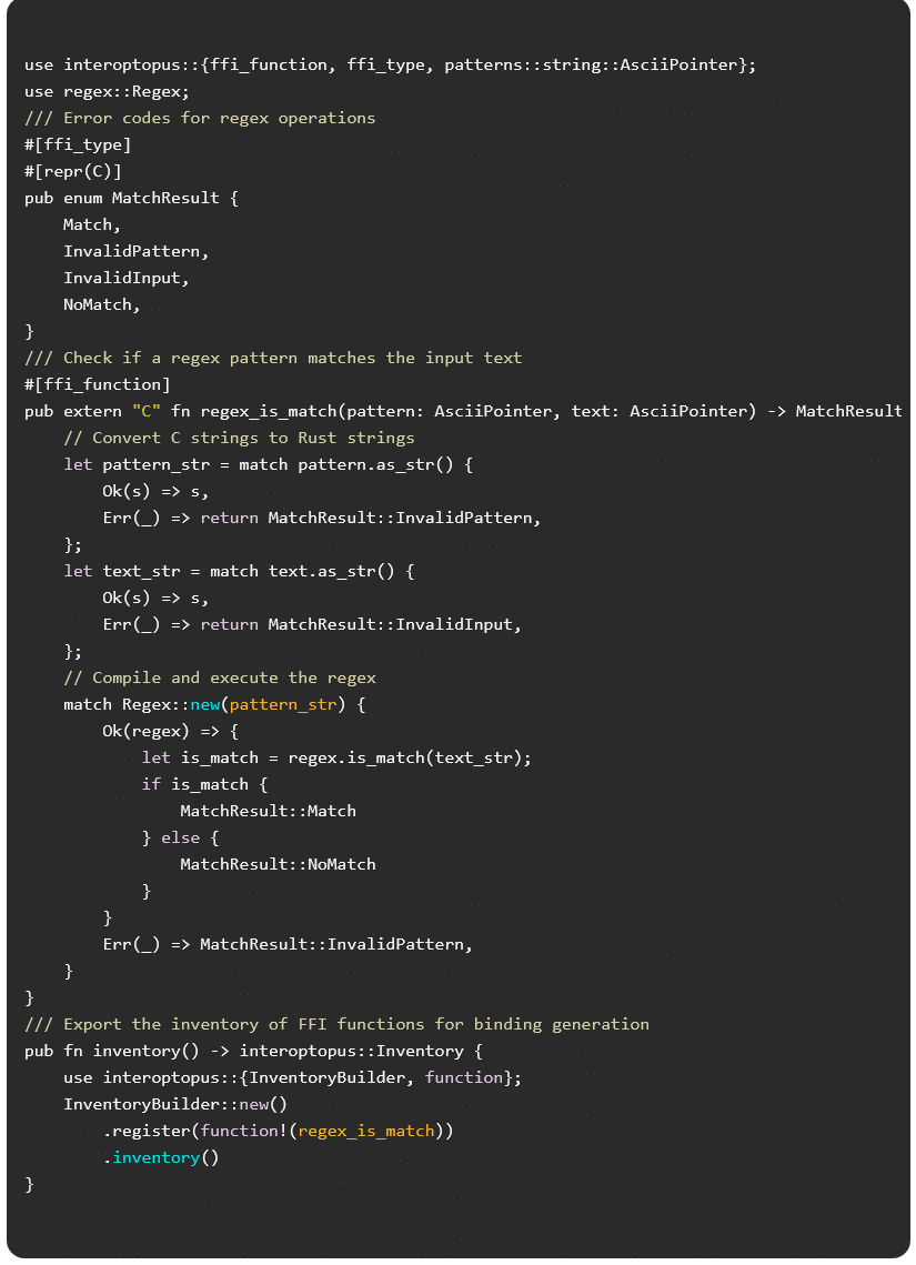 - Einem Wrapper für die Rust-Regex-Bibliothek mit entsprechenden Exportmarkierungen für FFI