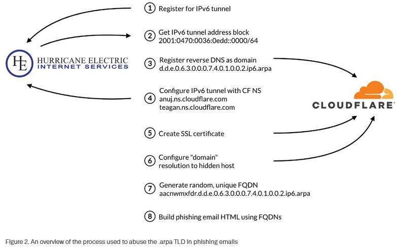 Der Angriff setzt auf ein koordiniertes Zusammenspiel zweier Dienste. Im ersten Schritt erwerben die Täter kostenlosen IPv6-Adressraum über sogenannte Tunneldienste – Dienste, die IPv6-Datenverkehr über bestehende IPv4-Verbindungen transportieren. Hurricane Electric ist einer der bekanntesten Anbieter solcher Tunnel und stellt sie kostenlos zur Verfügung. Mit der Zuteilung eines IPv6-Adressbereichs erhalten die Nutzer automatisch auch die administrative Kontrolle über die zugehörige .arpa-Subdomain im DNS – ein technisch vorgesehener Mechanismus, der die eigenständige Verwaltung der Reverse-DNS-Einträge ermöglichen soll.