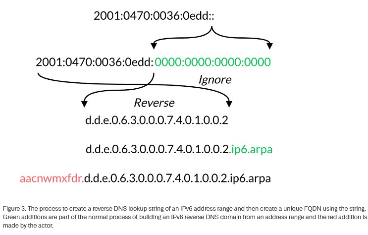 Der lange, technisch wirkende String basiert auf der umgekehrten Darstellung der zugeteilten IPv6-Adresse, ergänzt um eine zufällig generierte Subdomain, die jede verwendete Adresse einzigartig macht und eine gezielte Blockierung einzelner Einträge erschwert. Da die Angreifer einen /64-Adressbereich kontrollieren, können die hinteren 64 Bits der Adresse variabel gesetzt werden – der Vorrat an möglichen Domains ist damit praktisch unbegrenzt.
