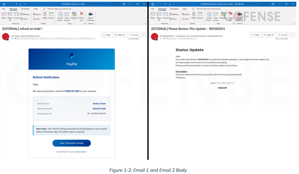 Der Angriff beginnt in beiden Fällen mit einer E-Mail, wobei die Angreifer zwei verschiedene Köder einsetzen: