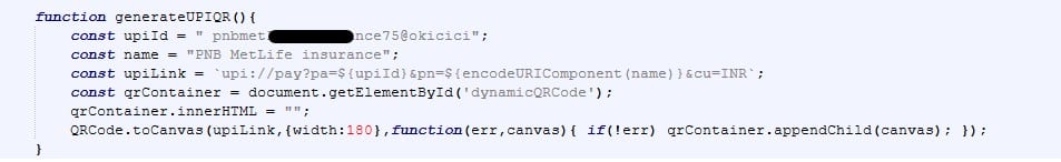 Der aus der Seite extrahierte JavaScript-Code zeigt die clientseitige Generierung des UPI-QR-Codes: