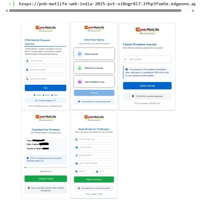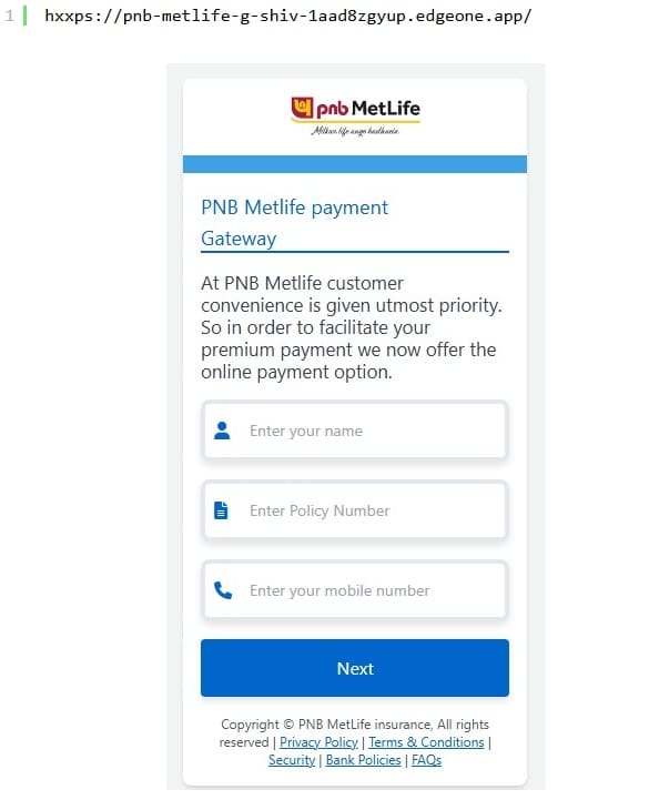 Die initiale Vorlage zeigt eine für Smartphones optimierte Oberfläche unter dem Namen „PNB MetLife Payment Gateway“. Nutzer werden aufgefordert, Name, Versicherungsnummer und Mobilfunknummer einzugeben – angeblich zur Prämienzahlung erforderlich.