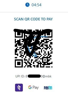 Im Anschluss wechselt die Darstellung zu einem UPI-basierten Zahlungsablauf. Das Formular verschwindet, stattdessen erscheint ein QR-Code mit Countdown-Timer, was zeitlichen Druck aufbaut.