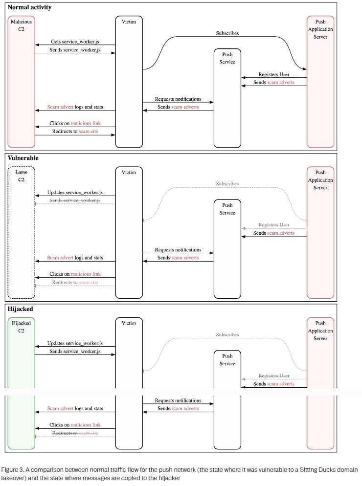 Die aufgegebene Domain wurde verwendet, um die Service-Worker-Software zu hosten und Opfer zu Betrugsangeboten umzuleiten. Die Benachrichtigungs-URLs enthielten automatische Weiterleitungen zu einem Traffic Distribution System (TDS) des Affiliate-Werbenetzwerks.
