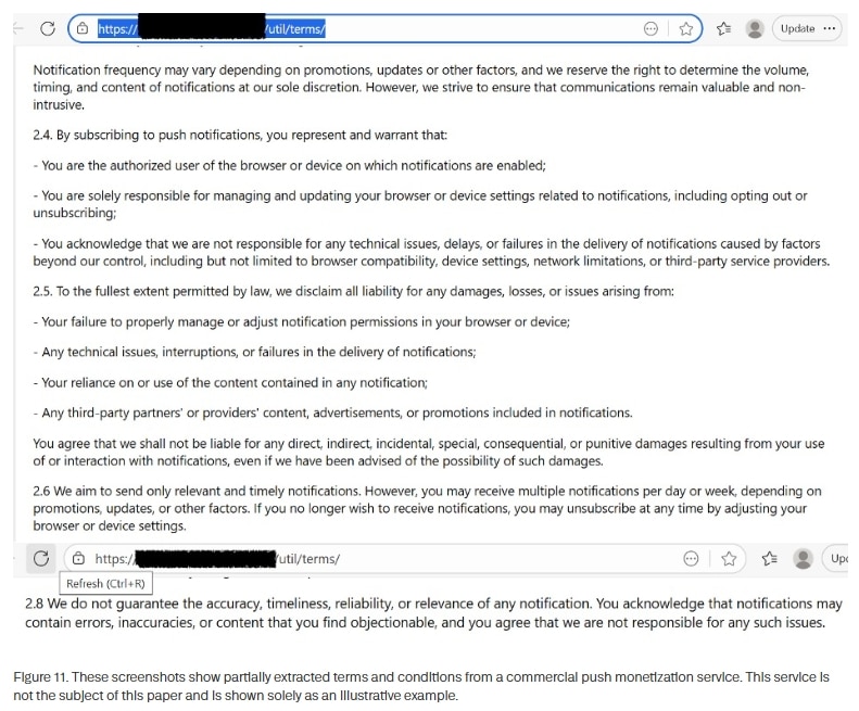 Viele Push-Monetarisierungsdienste weisen in Nutzungsbedingungen darauf hin, dass „Benachrichtigungen Fehler oder anstößige Inhalte enthalten können“ – die Verantwortung wird auf Nutzer verlagert. Werbenetzwerk-Richtlinien bewegen sich zwischen verschiedenen Graden der Täuschung, werden aber kaum durchgesetzt.