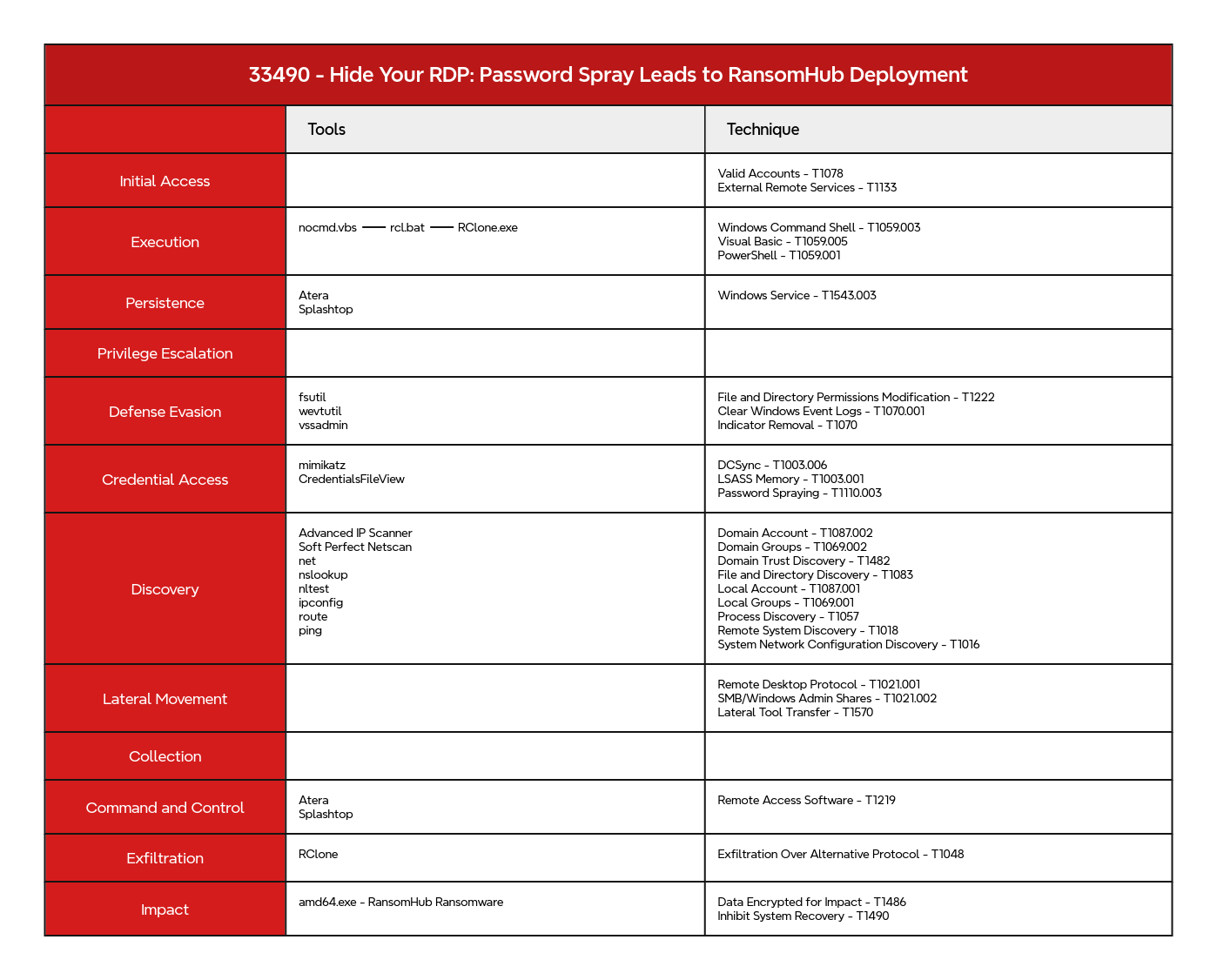 Im finalen Schritt des Angriffs wurde die RansomHub-Ransomware in der Umgebung verteilt. Die Verbreitung erfolgte netzwerkweit über SMB-Freigaben sowie durch die Ausführung über Remote-Dienste. Der Vorfall unterstreicht einmal mehr die Gefährdung durch unzureichend gesicherte RDP-Zugänge und den professionellen Werkzeugeinsatz moderner Angreifer.