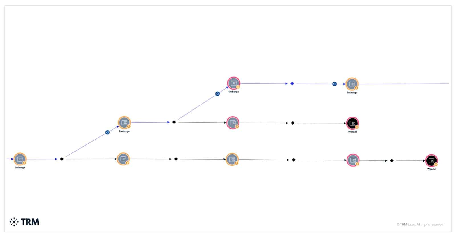 Obwohl TRM zwei Einzahlungen in den Wasabi-Mixer identifiziert hat, verlässt sich Embargo nicht in hohem Maße auf Mixer oder Cross-Chain-Bridges, um seine Aktivitäten zu verschleiern. Stattdessen wäscht die Gruppe Gelder in der Regel über Zwischen-Wallets – oft durch die Schichtung von Transaktionen über mehrere Adressen – bevor sie schließlich direkt bei VASPs eingezahlt werden.