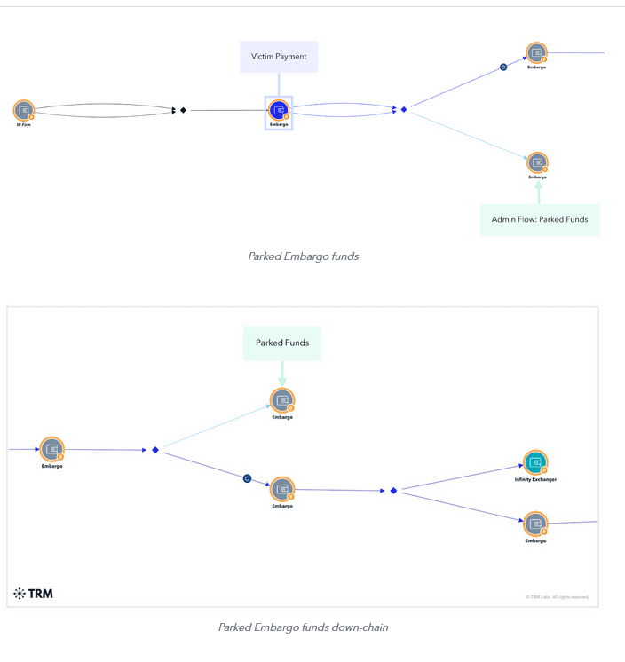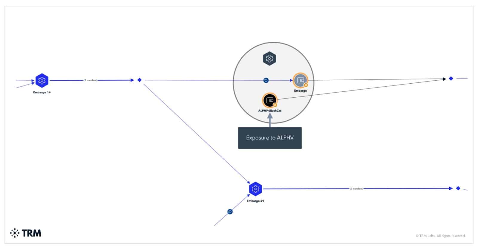TRM hat außerdem bemerkenswerte Überschneidungen zwischen Embargo und BlackCat Ransomware in der Blockchain festgestellt, was die Einschätzung bestätigt, dass Embargo eine umbenannte Version der inzwischen aufgelösten Gruppe sein könnte. Historische Adressen mit Verbindungen zu BlackCat haben Gelder an Wallet-Cluster weitergeleitet, die mit Opfern von Embargo in Verbindung stehen. Darüber hinaus haben Embargo-Partner im Einklang mit ihrem RaaS-Modell an Kampagnen für andere Ransomware-Gruppen teilgenommen, was die opportunistische und flexible Natur der Beteiligung von Partnern an mehreren Operationen widerspiegelt.