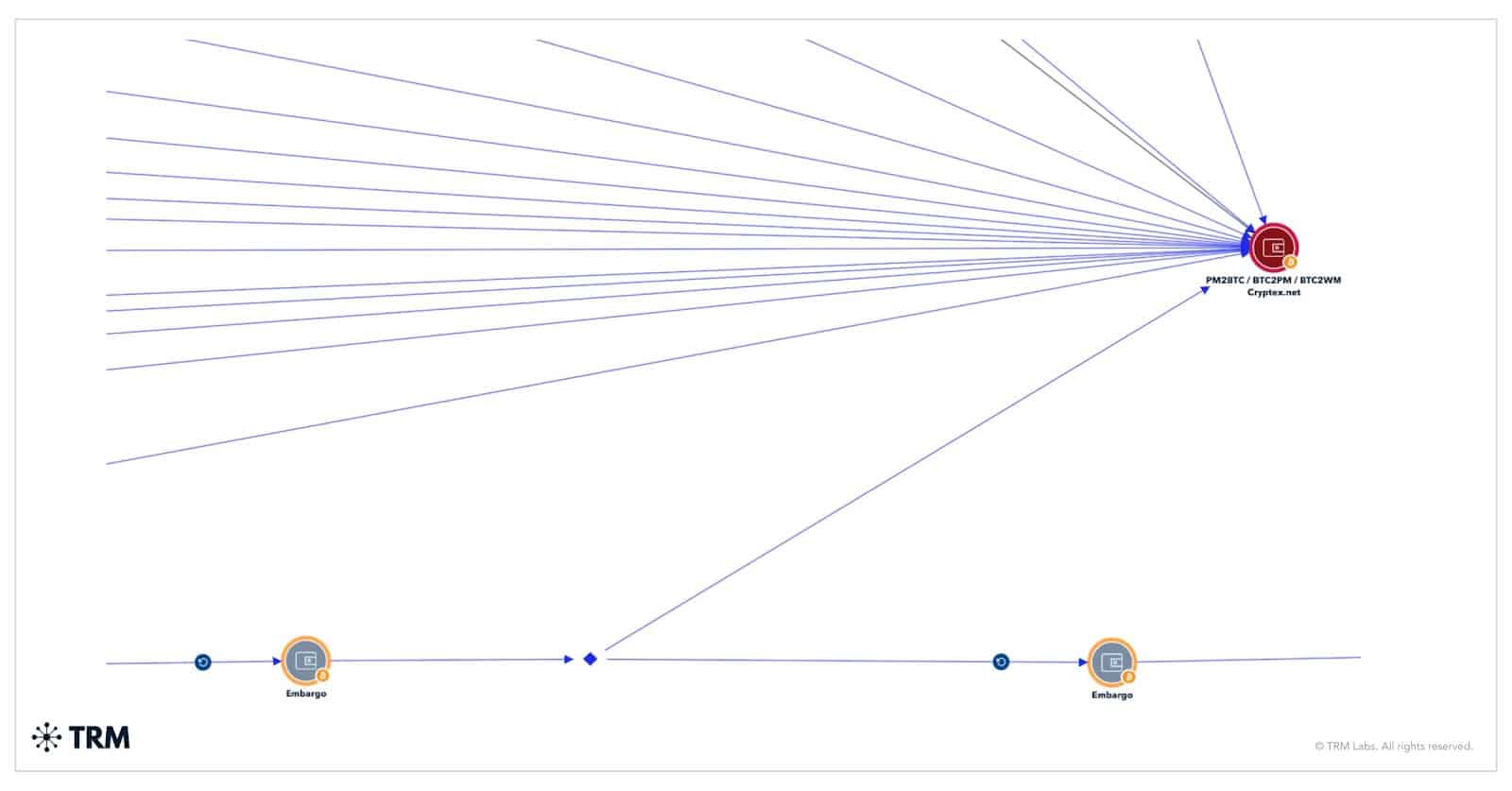 TRM hat Gelder von Zahlungsadressen der Opfer von Embargo zu einer Reihe von Zielen zurückverfolgt, darunter globale Anbieter von Dienstleistungen für virtuelle Vermögenswerte (VASPs), nicht verwahrende und risikoreiche Börsen, Mixing-Dienste, Peer-to-Peer-Marktplätze und die inzwischen sanktionierte Plattform Cryptex.net.