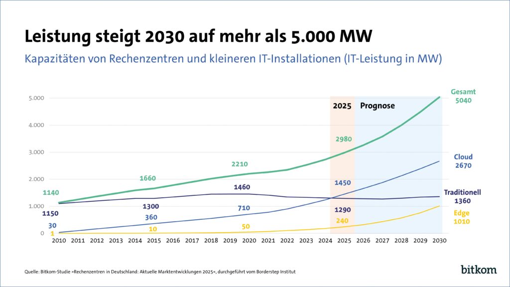 Insgesamt sind hierzulande rund 2.000 Rechenzentren mit einer Leistung von über 100 Kilowatt in Betrieb, davon 100 Großanlagen über 5 Megawatt. 2025 wächst die gesamte Rechenzentrumsleistung um neun Prozent auf knapp 3.000 Megawatt, 2030 soll die Marke von 5.000 Megawatt erreicht werden – fast doppelt so viel wie 2024.