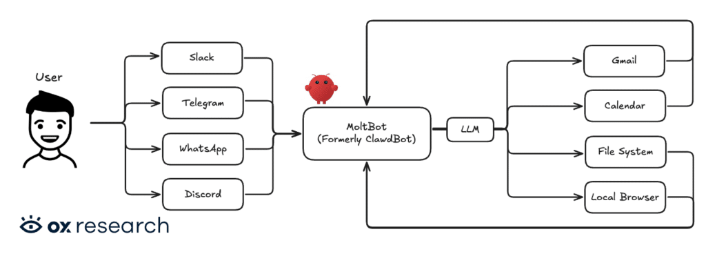 Jeder Kanal, über den MoltBot erreichbar ist, stellt einen möglichen Angriffsvektor dar. Die Software leitet Eingaben über Konnektoren an einen zentralen Server weiter, der sie dann an ein Large Language Model übergibt. Ein Angreifer mit Zugang zu einem verbundenen Account könnte theoretisch alle anderen verknüpften Dienste kompromittieren.
