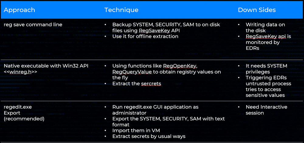 Um effektiv auf diese Geheimnisse und Anmeldeinformationen zugreifen zu können, ist häufig eine direkte Interaktion mit den Registrierungsstrukturen SAM und SECURITY erforderlich.