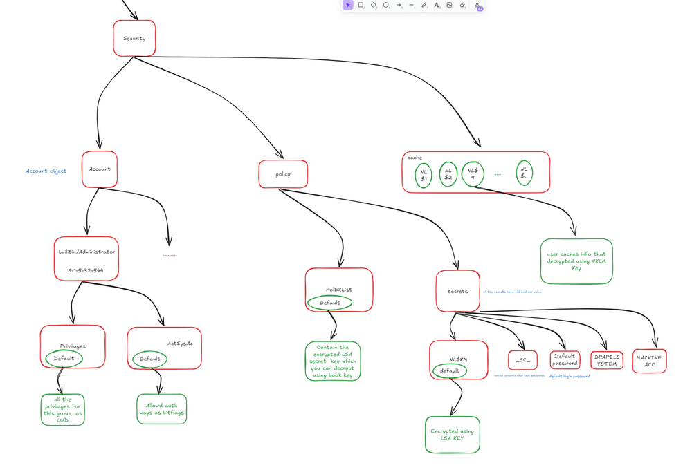 Das Windows-Subsystem, das für die Verwaltung von Geheimnissen und Anmeldeinformationen zuständig ist, ist die Lokale Sicherheitsbehörde (LSA), die innerhalb des Prozesses lsass.exe ausgeführt wird. Die LSA verwaltet zwei In-Memory-Datenbanken: die SAM-Datenbank und die Sicherheitsdatenbank (Richtlinie), die den Registrierungsstrukturen SAM und SECURITY auf der Festplatte entsprechen.