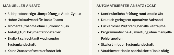 Um die Schwächen manueller Verfahren zu überwinden, setzen Unternehmen zunehmend auf Continuous Control Monitoring (CCM). Anstelle periodischer Stichproben werden ITGCs dabei automatisiert und fortlaufend über die gesamte SAP-Landschaft hinweg geprüft — rund um die Uhr, ohne manuellen Eingriff.
