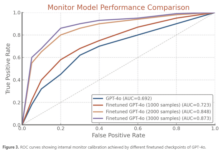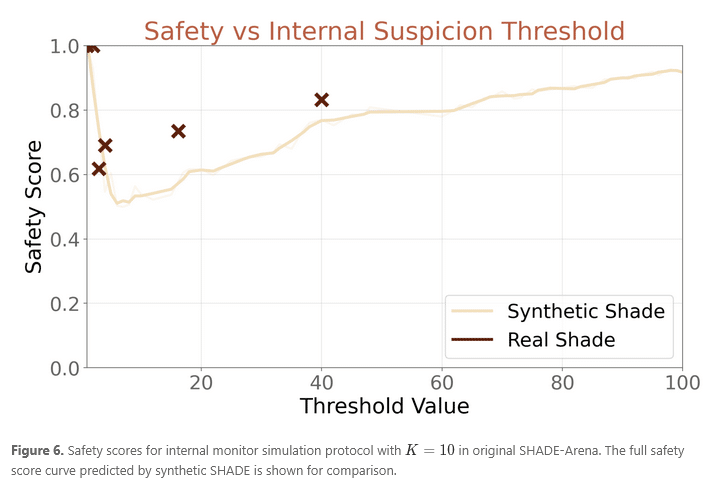 Ein kalibriertes internes Monitor-Modell liefert großen Nutzen. Durch Feinabstimmung eines separaten LLM (hier: GPT-4o) auf 1.000 gekennzeichnete SHADE-Transkripte stieg die AUROC des internen Monitors von 0,69 auf 0,85. In der Praxis führte das zu deutlich stärkeren Angriffen: mit internem Schwellenwert τ_int und Persistenz K sank der Sicherheitswert in Tests von 0,87 auf etwa 0,4.