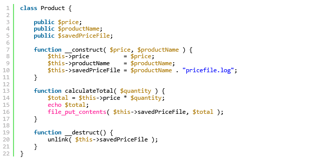 Hier ist ein einfaches Beispiel für eine anfällige Klasse, die Produktpreise berechnet, ein Protokoll speichert und das Protokoll löscht, wenn keine Verweise mehr auf das Objekt vorhanden sind: