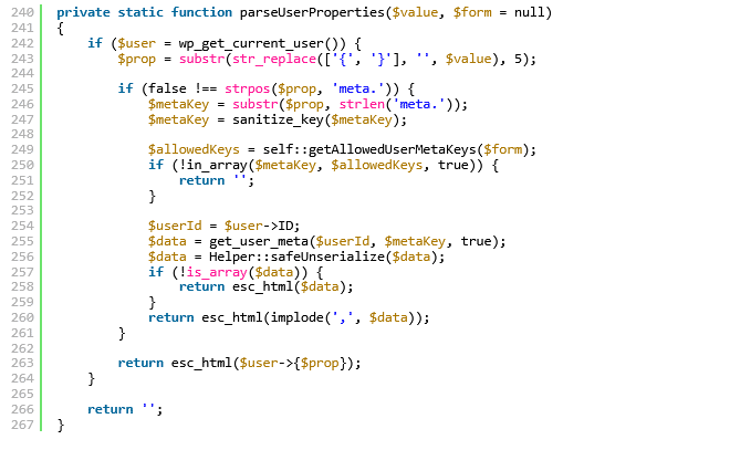 Eine Untersuchung des Codes zeigt, dass das Theme die Funktion parseUserProperties() in der Klasse FluentForm\App\Services\FormBuilder\EditorShortcodeParser verwendet, um Smart-Codes von Benutzern zu analysieren.