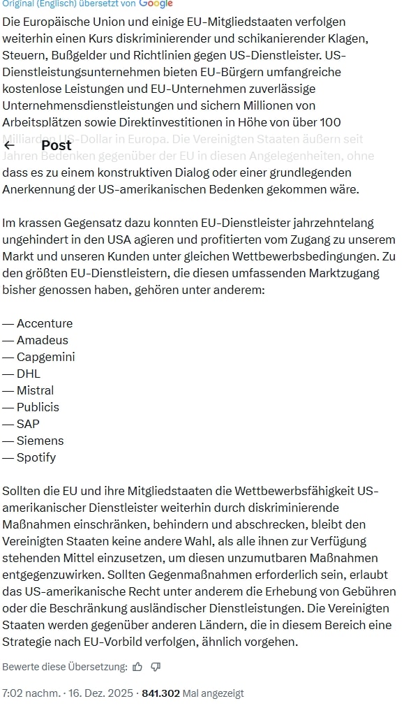 Washington habe bereits seit Jahren wiederholt Bedenken zu diesen Themenfeldern gegenüber Brüssel artikuliert. Nach US-Darstellung führten diese Interventionen jedoch weder zu einem konstruktiven Dialog noch zu einer grundsätzlichen Anerkennung der amerikanischen Standpunkte.