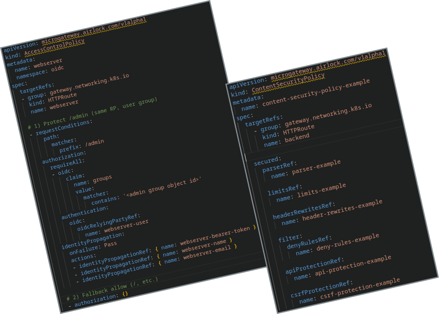 Airlock Microgateway nutzt das Policy Attachment Model der Gateway API konsequent. Routing-Konfigurationen bleiben Standard-Kubernetes-YAML, während Sicherheitsrichtlinien über Custom Resource Definitions (CRDs) wie AccessControlPolicy und ContentSecurityPolicy angebunden werden.
