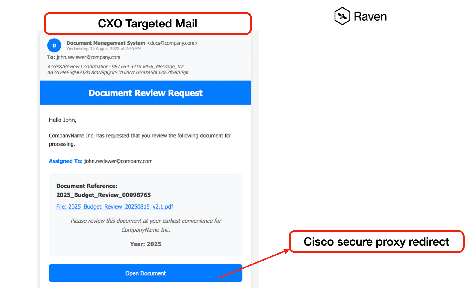 Kürzlich hat die kontextbezogene KI von Raven AI ein anschauliches Beispiel für die missbräuchliche Nutzung von Cisco Safe Links aufgedeckt. Die Phishing-E-Mail wirkte auf den ersten Blick völlig legitim: Sie gab vor, von einem E-Signatur-Dienst zu stammen und forderte die Überprüfung eines Dokuments namens „2025_Remittance_Adjustment“ an. Professionelles Branding, geschäftstaugliche Terminologie und eine klare Handlungsaufforderung machten die Nachricht besonders glaubwürdig.