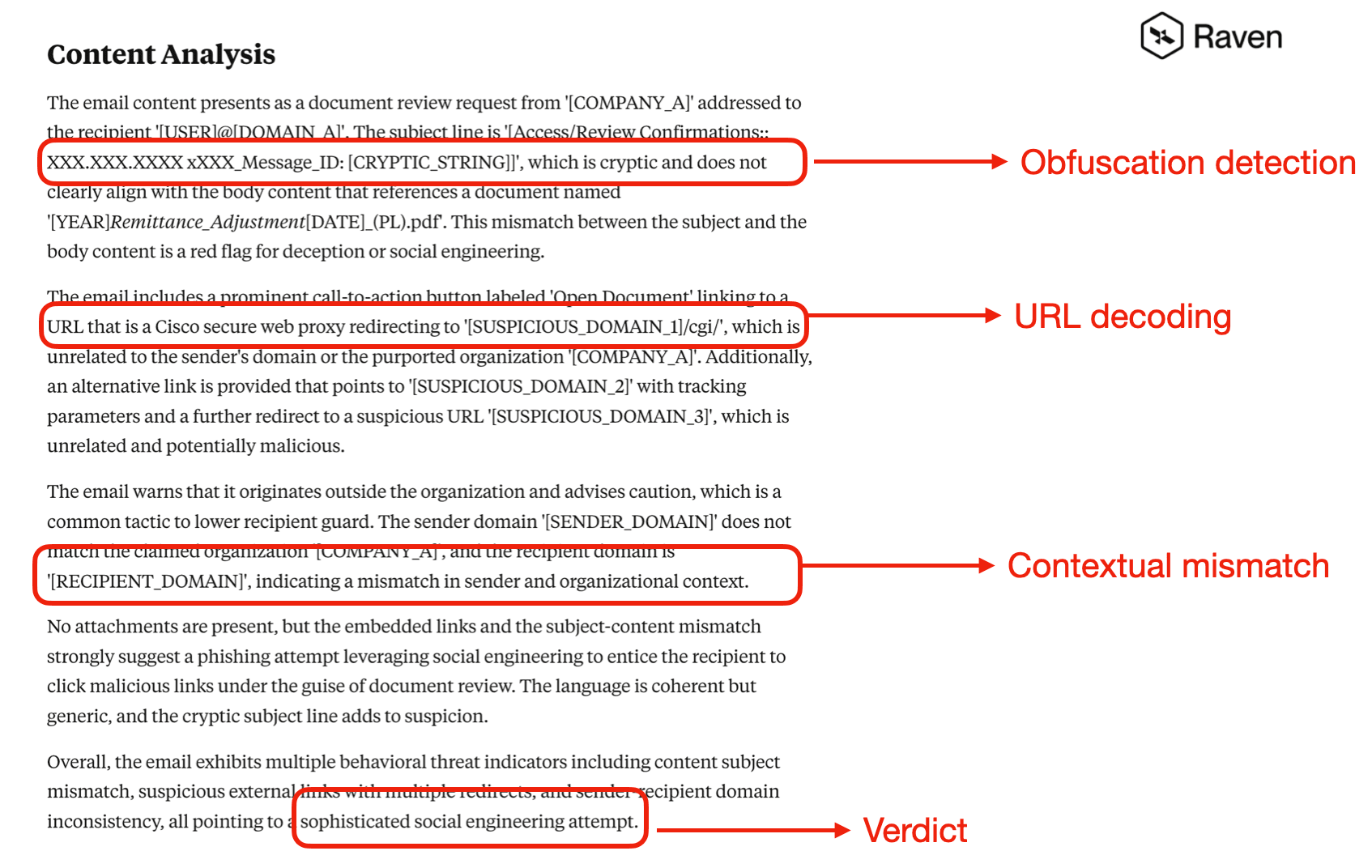Die KI von Raven AI analysiert nicht nur den Inhalt von E-Mails, sondern berücksichtigt auch den Kontext der Organisation und relevante Signale, um Bedrohungen zuverlässig zu erkennen.