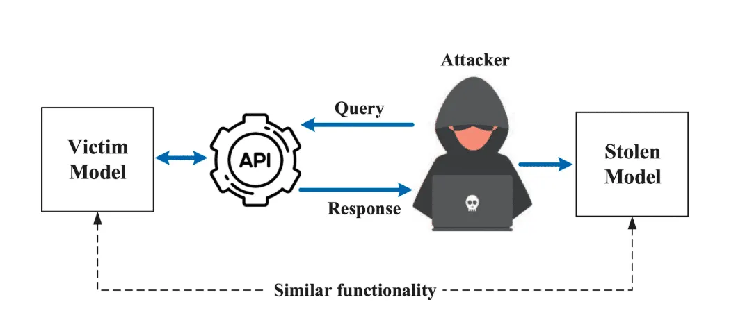 Genau diese Modelle können über einen Angriff repliziert werden, der unter dem Begriff Modellextraktion bekannt ist. Der Ablauf ist methodisch und verhältnismäßig einfach: Ein Angreifer sendet zahlreiche Eingaben an die öffentliche API eines Zielmodells, sammelt die zugehörigen Ausgaben und trainiert damit ein eigenes Ersatzmodell. Weder die Architektur des Originalmodells noch die Trainingsdaten müssen dabei bekannt sein.