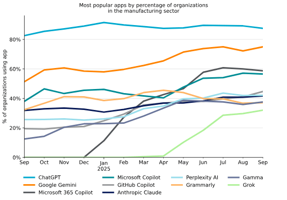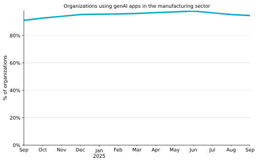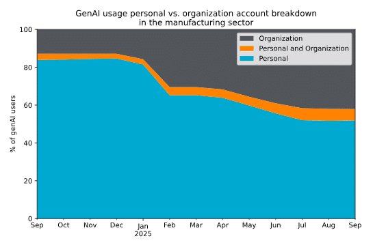 Die Nutzung von GenAI im Fertigungssektor bleibt hoch: 94 % der Organisationen setzen GenAI-Anwendungen direkt ein, 97 % nutzen Apps, die Daten für Modelltraining verwenden, und 96 % greifen indirekt auf GenAI-Tools zu. Persönliche Konten gingen von 83 % Ende 2024 auf 51 % im September 2025 zurück, während organisationsweit zugelassene Lösungen von 15 % auf 42 % stiegen – ein Zeichen für die zunehmende Präferenz sicherer, unternehmensgerechter Plattformen.