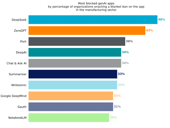 Die am häufigsten blockierten Apps sind DeepSeek (48 %) und ZeroGPT (43 %), da sie Transparenz- und Sicherheitsrisiken bergen. Unternehmen setzen zunehmend auf unternehmenseigene GenAI-Plattformen wie OpenAI über Azure (37 %), Amazon Bedrock (31 %) und Google Vertex AI (7,8 %), um Modelle privat zu hosten und maßgeschneiderte Lösungen zu entwickeln.